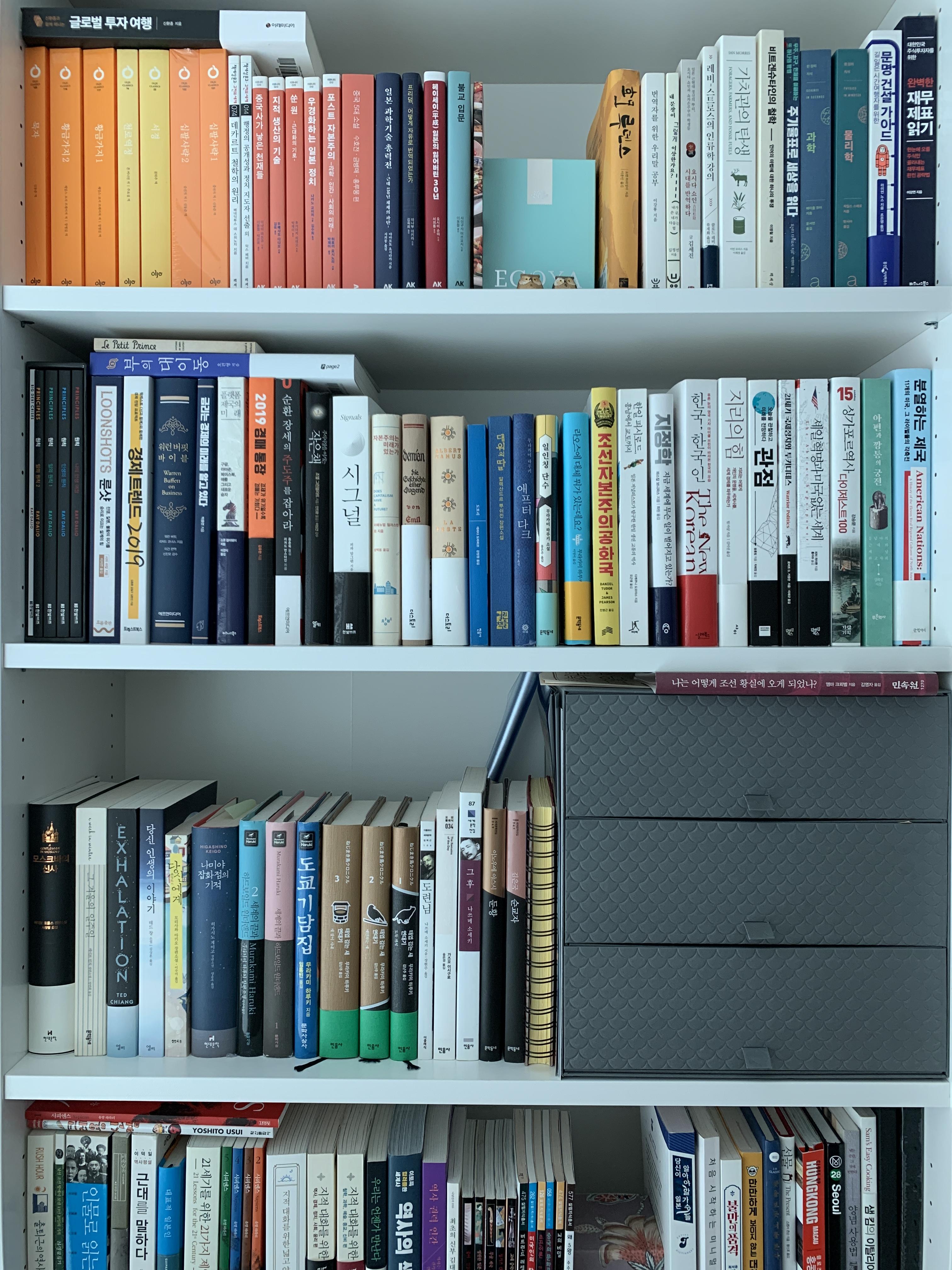 앞의 사진을 찍고 책장을 정리했다. 매년 1~2월에 행하는 나만의 행사라고 할 수 있다. 이때 정리할 책과 조금 두고볼 책, 그리고 소장할 것을 분류한다. 정리할 책은 대부분 중고서점에 보낸다. 책장 중간의 회색 서랍함에는 책갈피와 띠지와 겉싸개 등을 보관한다. 평소에는 계륵이지만 중고책으로 팔릴 때는 최상급과 상급을 가르는 중요한 물품이다. 올해도 한 권 더 읽고, 독후감도 한 편 더 쓰길 희망해본다.