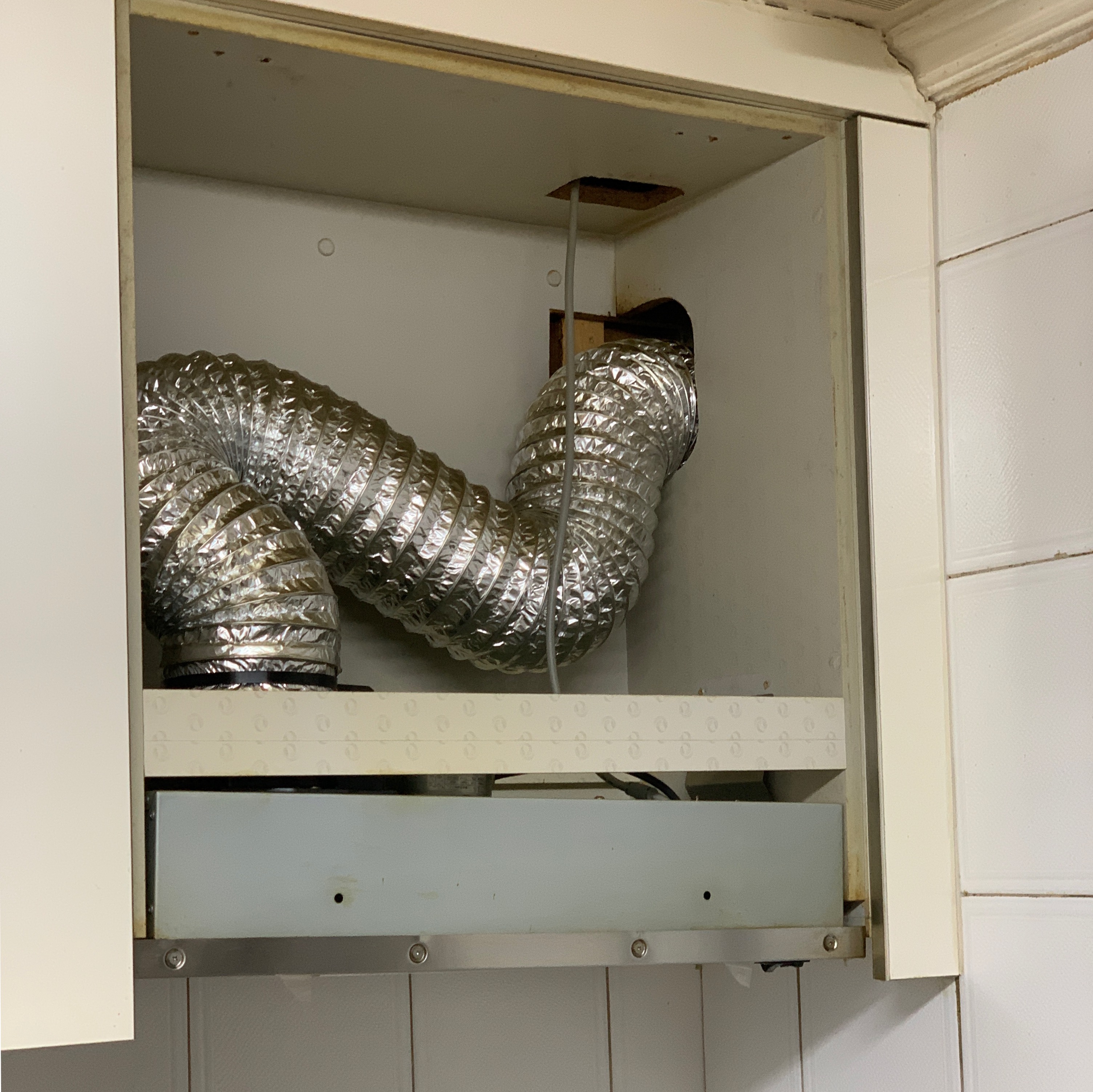 후드 교체에 앞서 후드를 가려주던 도어를 먼저 탈거했다. 도어가 사라지니 처참하게 S자로 구부러진 자바라와 후드 본체, 그리고 벽에 누렇게 낀 기름때가 보였다. 특히 자바라는 굽을 때마다 후드의 효율이 급격히 떨어진다고 하는데 처음부터 저렇게 설치됐던 건지 뭔지 알 수 없었다. 더 충격적인건 배기구 쪽 자바라는 찢어진 상태라서 이 후드가 사실상 배기의 역할은 못하고 소음만 만들고 있었다는 것이다.