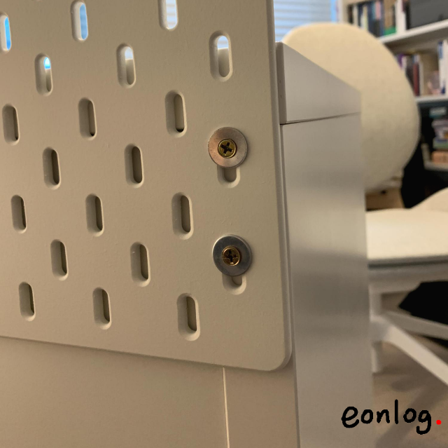 원래 36 X 56 사이즈 스코디스 페그보드만 달려고 했다가 좀 외로워보여서 56 X 56 스코디스를 추가로 달았다. 설치 방법은 동일하다. 단, 깊이가 얕은 패널에 나사를 박아야하므로 드릴로 나사 자리를 낼 때 너무 깊이 들어가지 않도록 주의해야 하고 (그렇지 않으면 패널을 관통한다), 그에 맞춰 좀 짧은(4.5*15mm) 나사가 2개 필요하다.
