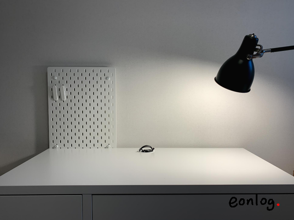 사실 스코디스 페그보드는 원래 위쪽에서 잡아주는 제품이라서, 이번처럼 아래에 고정시키면 액세서리 무게 때문에 위에서부터 휘지 않을까 우려됐었다. 다행히 이 제품의 강성(stiffness)이 꽤 좋은지 그런 문제는 아직까지 전혀 없다. 이케아 사장님이 보면 불편할지도 모르겠지만 나는 만족스럽게 쓰고 있다. 만세!