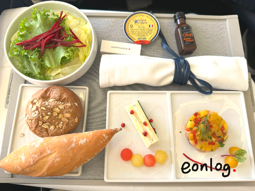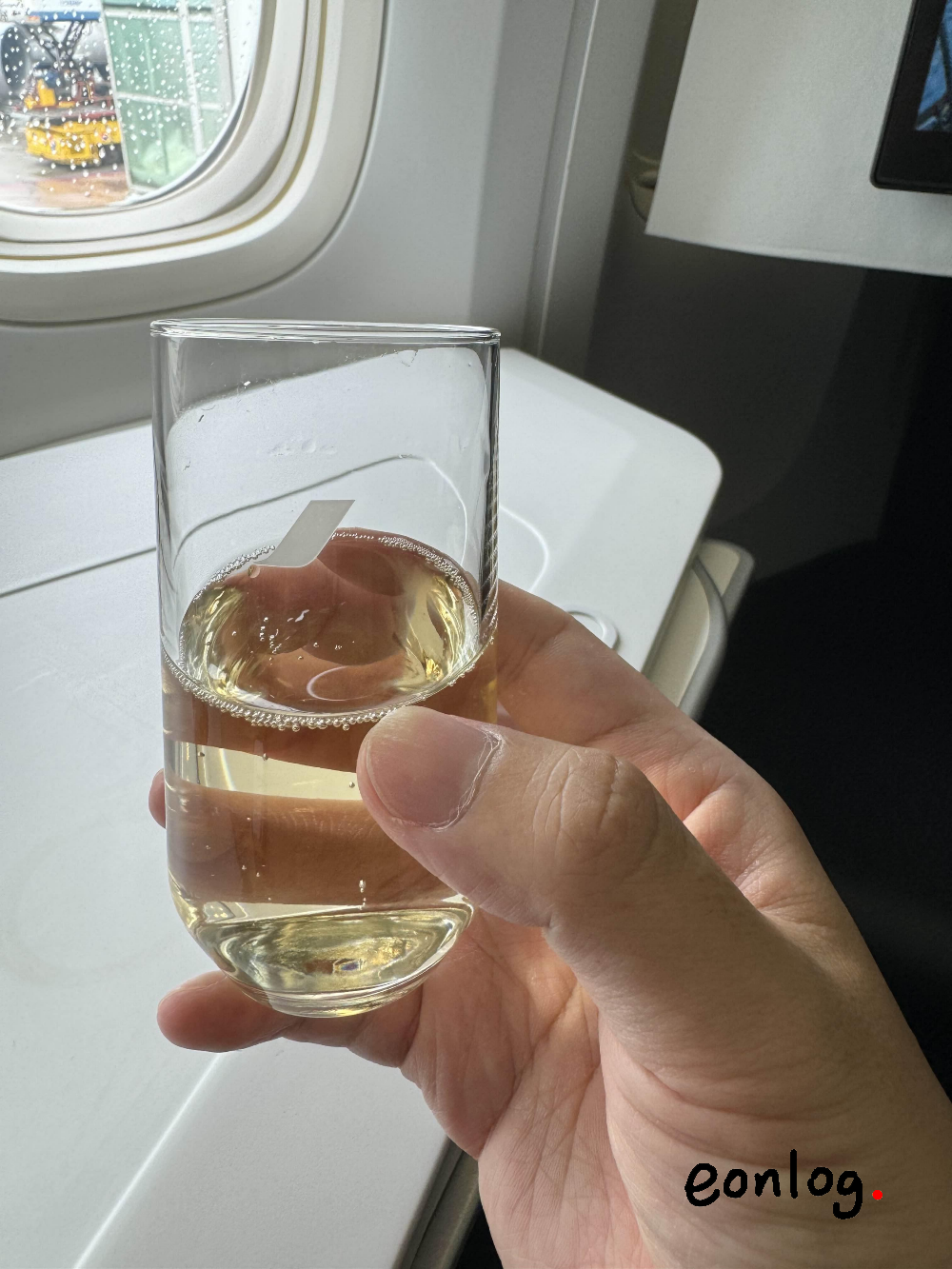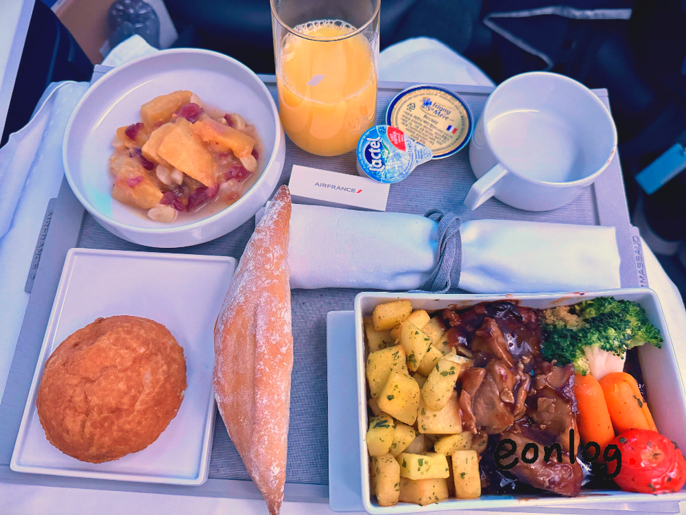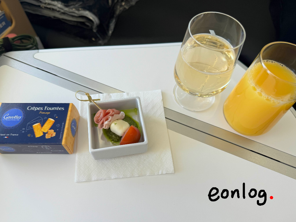 자리에 앉으니 곧 음료가 서빙됐다. 보통은 이때 물이나 주스를 고르는데 에어프랑스니까, 프랑스는 샴페인의 본고장이니까 샴페인을 받았다. 조화로운 맛이 특징이었고, 한 방울씩 느껴지는 단맛이 좋았다. 한국에서도 쉽게, 비싸지 않게 구할 수 있는 샴페인이라고 하니까 다음에 한 번 구해보고 싶었다.