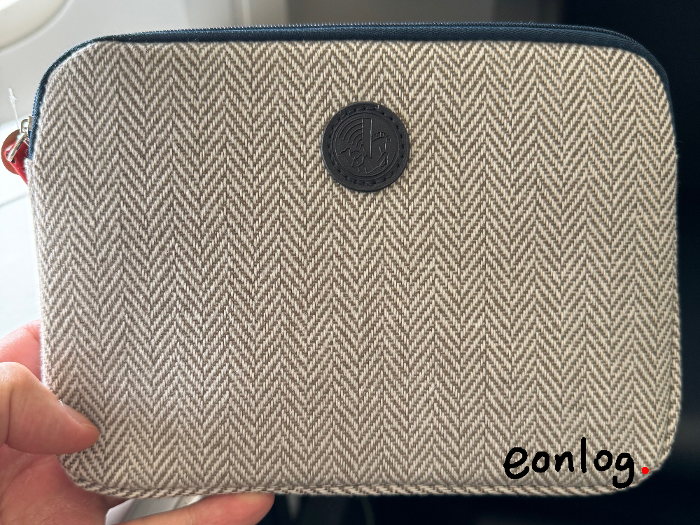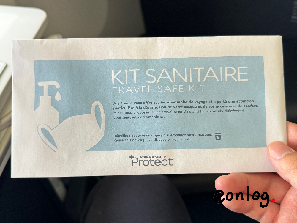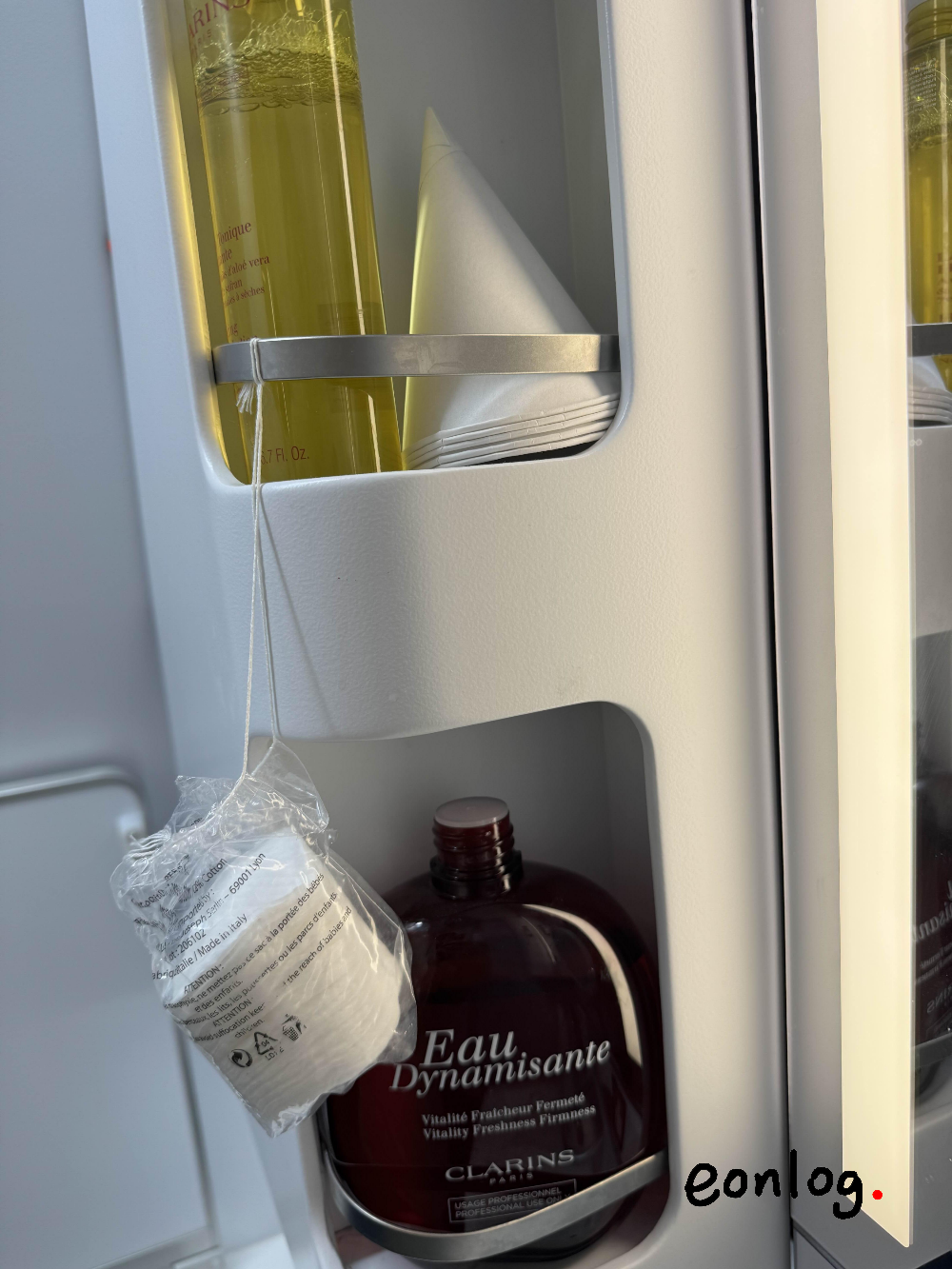 이어서 어매니티와 위생키트가 제공 됐다. 어매니티에는 치약, 칫솔, 양말과 간단한 클라랑스 화장품 샘플들이 들어있었다. 별도로 지급된 위생키트는 알코올티슈와 핸드새니타이저, 마스크가 동봉되어 있었다. 코로나의 흔적일 것이다.