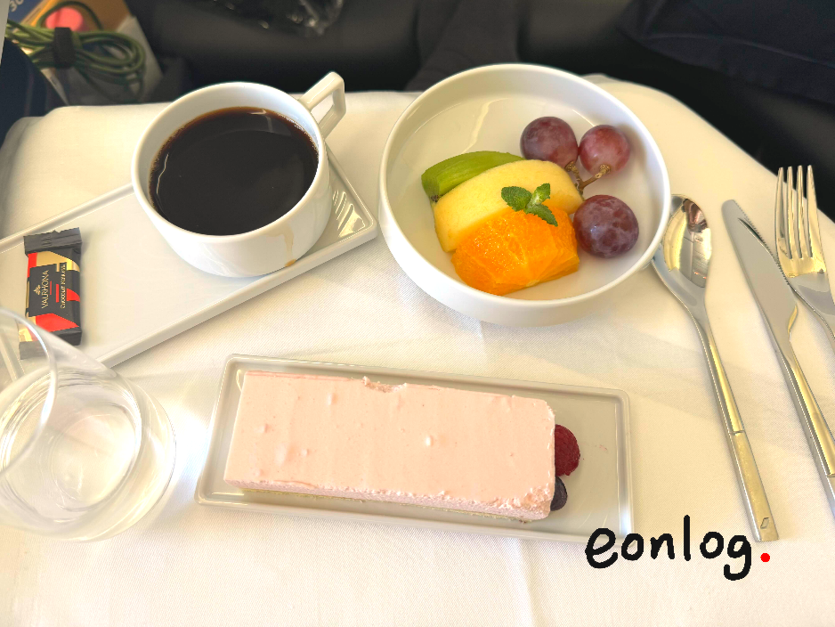 메인 디쉬 다음은 치즈가 서빙될 차례였는데, 치즈를 딱히 좋아하지 않아서 스킵했다. 아까 그 승무원👨🏻🎨이 자꾸 블루치즈를 권했는데 다 남길게 뻔해서 완고하게 물렸다. 쏘리 무슈.