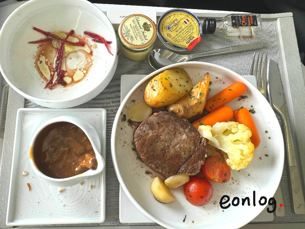 애피타이저가 서빙되면서 음료를 요청하면서 ‘do you have something sparkling’라고 했다가 안경 쓴 승무원으로부터 어릴 적 옳은 답을 할 때까지 기다리는 영어선생님의 익살스러운 표정과 함께 ‘스파클링이 아니고 샴팡이에요’라는 한마디를 들었다. 👨🏻🎨 오케이 크로크무슈.