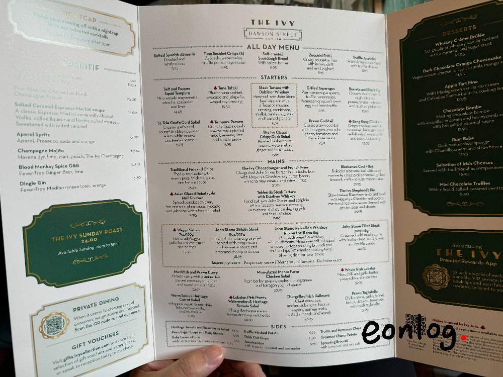 저녁식사 장소는 ‘The Ivy Dublin’이란 이름의 식당으로, 화려한 실내가 인상적인 곳이었다. 컬러풀한 내부 만큼이나 메뉴판도 예뻤다. 더블린의 잿빛 하늘 아래에서 더욱 대조되는 발랄한 분위기였다.