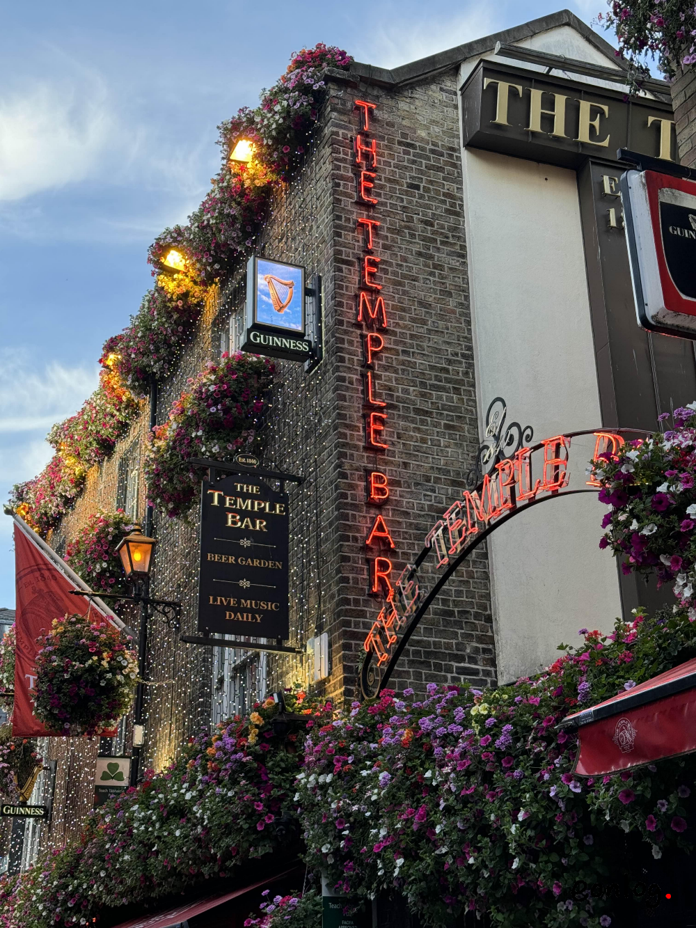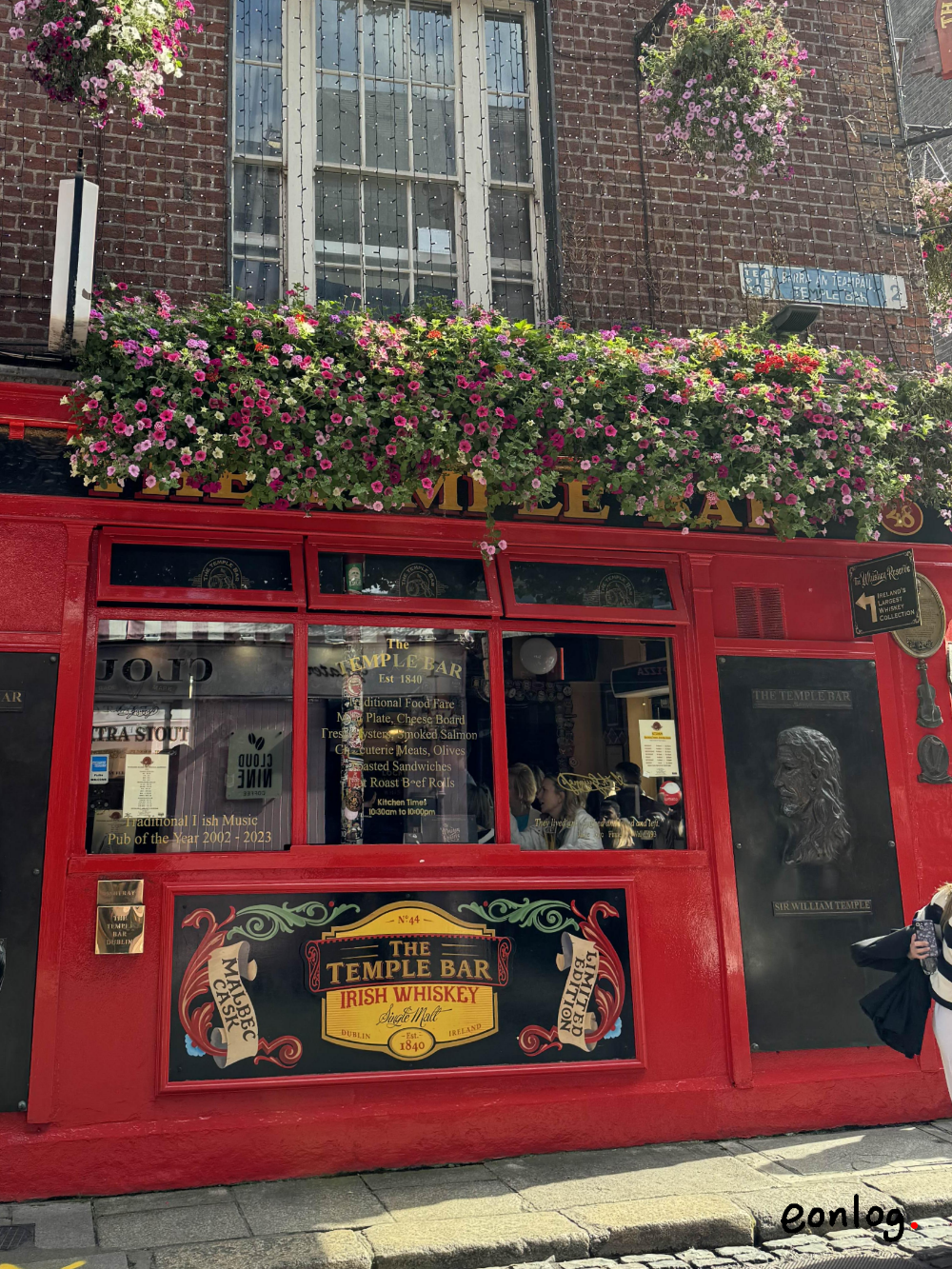 ⬇️ 밝은 낮에 다시 찾은 The Temple Bar☘️. 낮에도 여전히 많은 사람들로 붐볐지만, 전날 밤보다는 훨씬 여유로워서 더 잘 둘러볼 수 있었다. 건물 밖은 고전적인 붉은 벽돌로 쌓은 벽과 그곳에 걸린 풍성한 화분이 눈에 들어왔다. 누군가는 건물 외벽에 걸어둔 화분을 제대로 관리하고 있는 것이 분명했다. 게다가 아일랜드는 잔디와 꽃이 자라기 좋은 기후인 것 같다. 한국이었다면 이런 화분의 꽃은 일찌감치 모두 죽고 산에서 날아온 잡초가 자라서 흉물처럼 되었을 것이다.