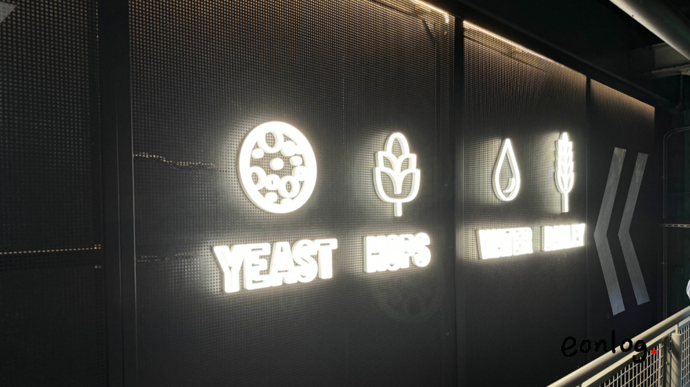 투어에 입장을 하면 가장 먼저 짧은 소개 영상을 보게 되고, 이어서 벽을 따라 기네스 맥주의 원료를 조명으로 그려놓은 것을 볼 수 있었다. 다음은 이스트, 홉, 물, 보리. 각각의 원료를 주제로 한 공간들이 있었는데, 물의 방은 천장에서 물이 쏟아지고 있었고, 보리의 방은 실제로 보리를 키우고 있어서 흥미로웠다.